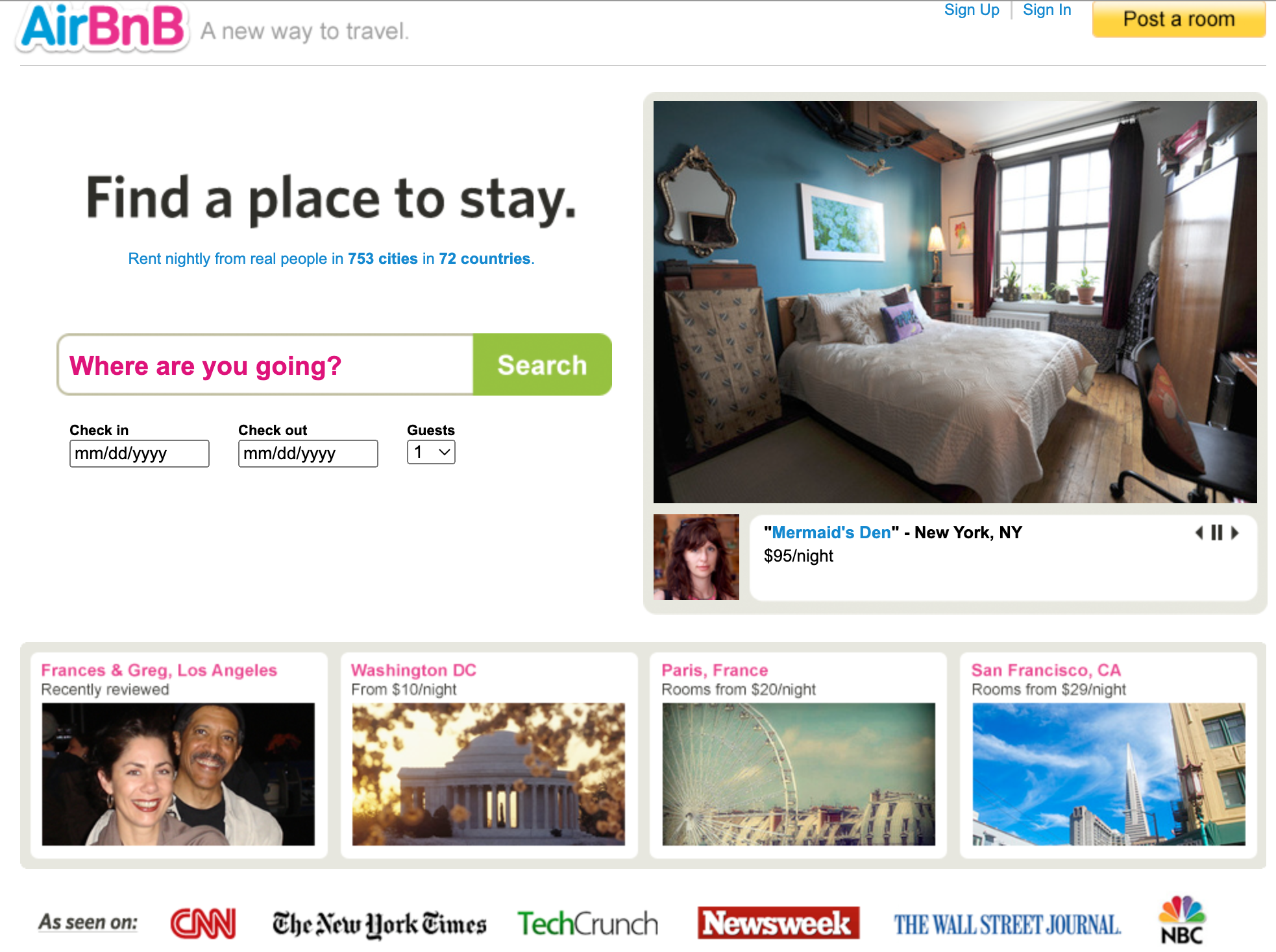 The inspiration for the very first versions of Airbnb mimicked hotel and travel websites but with far fewer features and less savvy design. Their platform provides an excellent example showing the importance of getting your product out there and evolving with the needs of the customer as they hop on board as consumers. Airbnb's first website iteration had only these few features: search by city, review listings and book it. While this may seem like nothing, they were still able to acquire customers.